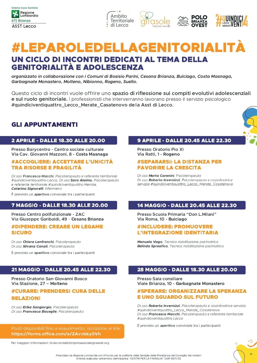 Si pone all’ attenzione dei genitori interessati un ciclo di incontri organizzati nei comuni del lecchese e proposti dagli operatori dell’Asst di Lecco sui temi della genitorialità e adolescenza.