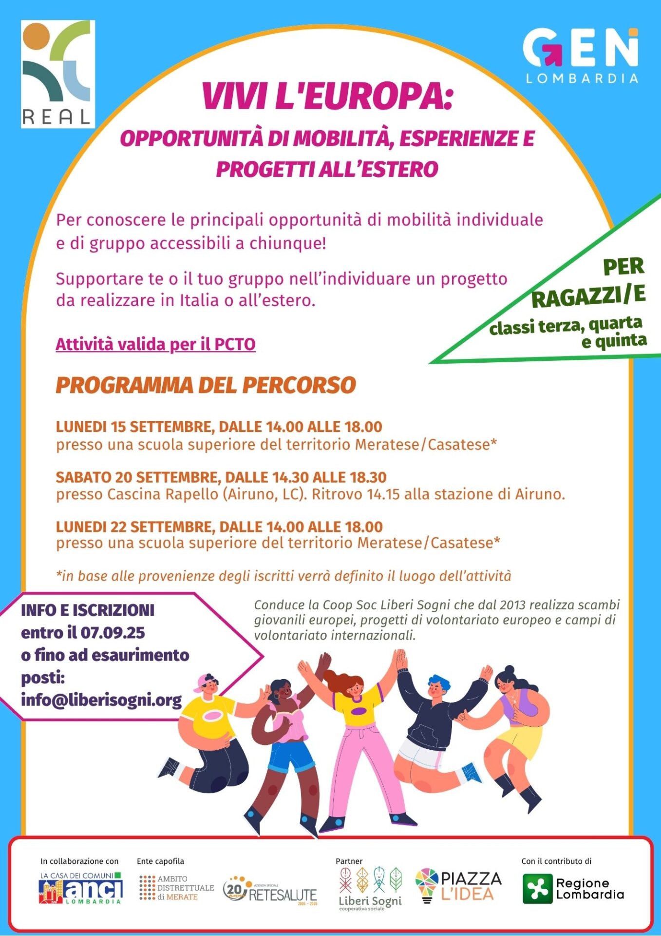 Si comunica che nei giorni 15-20-22 settembre pv, come da volantino in allegato, si terrà un breve corso di formazione sulle opportunità offerte ai giovani dall’Unione Europea, condotto da esperti della cooperativa Liberi Sogni onlus.