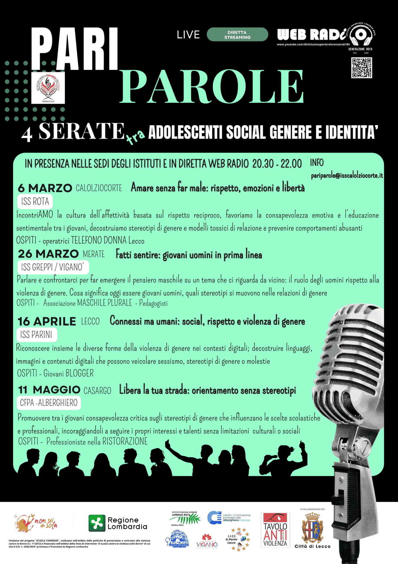 LE QUATTRO SERATE SARANNO IN DIRETTA WEB RADIO e aperte al pubblico in presenza nelle scuole ospitanti; i temi riguardano l’amore, il rispetto delle relazioni tra generi, l’uso degli stereotipi, la comunicazione dei social tra i giovani e le professioni di “genere”.