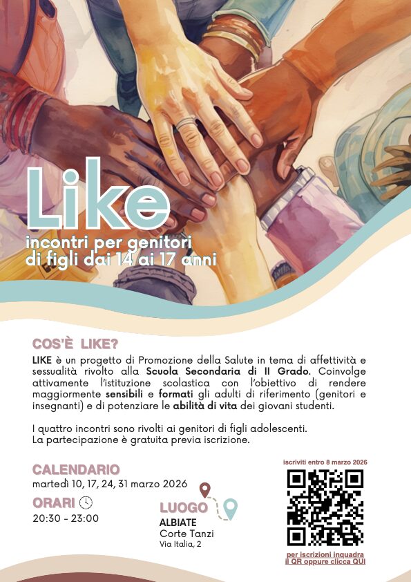Il percorso prevede quattro incontro incontri gratuiti, che si terranno nel mese di marzo presso Corte Tanzi – Albiate, dedicati ai temi dell’educazione sentimentale e della salute sessuale. Gli incontri offriranno uno spazio di confronto e strumenti utili per supportare ragazze e ragazzi nel loro percorso di crescita.